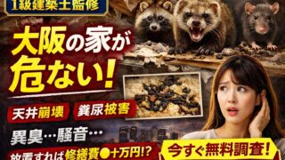大阪で急増する害獣被害。屋根裏の足音や異臭を放置すると修繕費は数十万円規模に。1級建築士が建物目線で本当に正しい対策を解説します。