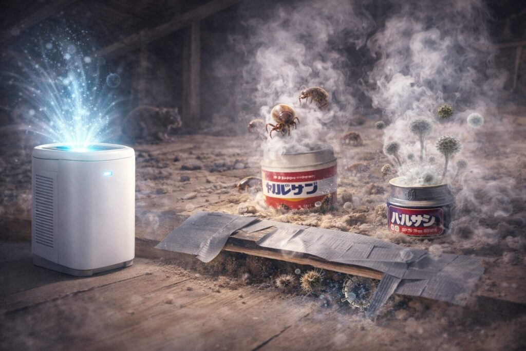 • 発生源が「壁の向こう」にある: 空気清浄機が綺麗にするのは「今リビングにある空気」だけです。天井裏という「汚染物質の製造工場」が稼働している限り、毒素は無限に供給され続けます。