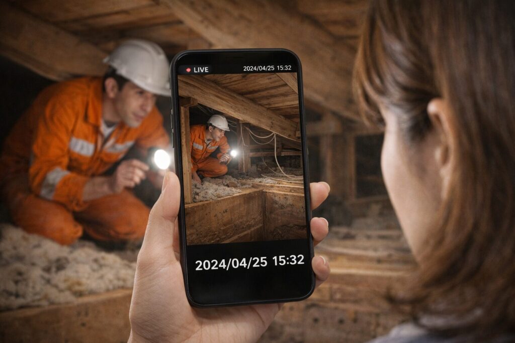 業者が屋根裏に上がる前に、必ずこう伝えてください。 「今日の新聞やスマホの時計と一緒に、被害箇所を動画で撮ってください」