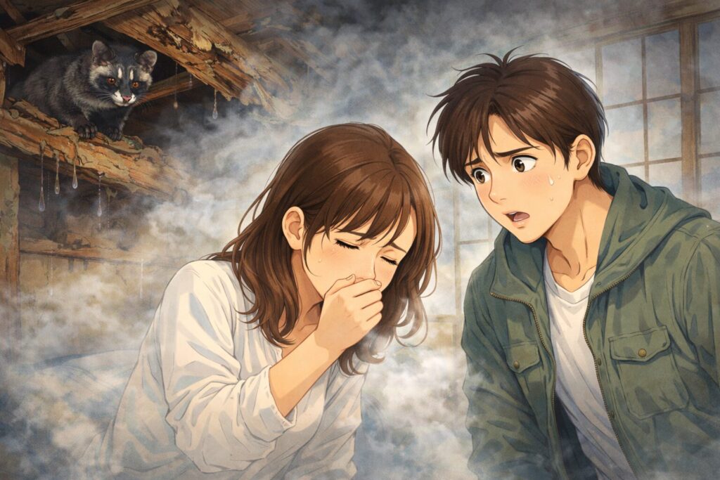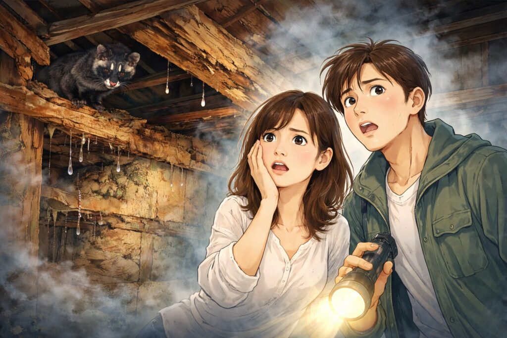 - 天井板の崩落: 数十キロに及ぶ糞尿の重みで、ある日突然、天井が腐り落ちてきます。
