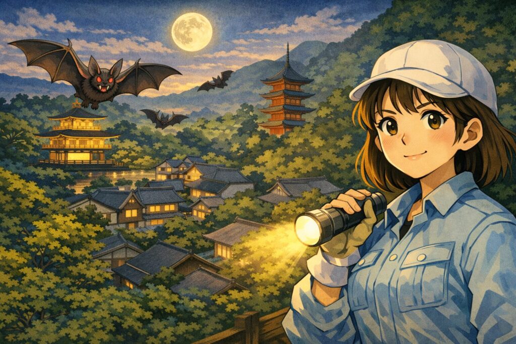 北区の衣笠や上賀茂、左京区の岩倉や修学院といったエリアは、コウモリにとって「最高の楽園」です。
