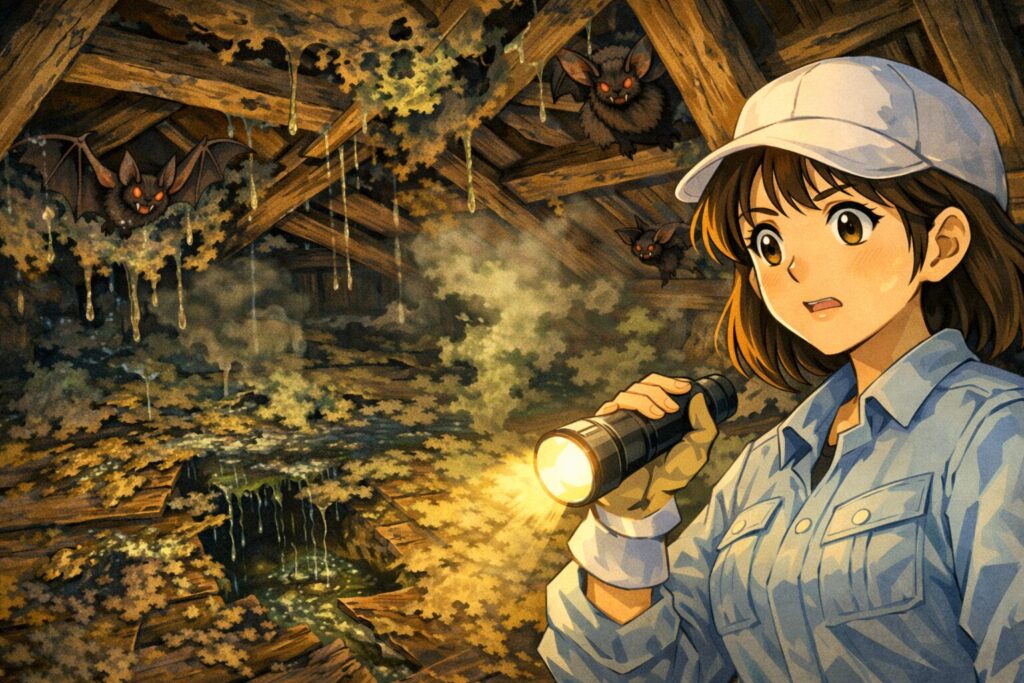 コウモリは決まった場所で排泄をします。溜まり続けたフンは湿気を吸い、強烈なアンモニア臭を放つだけでなく、天井板を腐らせ、最後には抜け落ちます。こうなると、単なる駆除では済みません。リフォーム費用として、一気に数百万円の出費を強いられることになります。