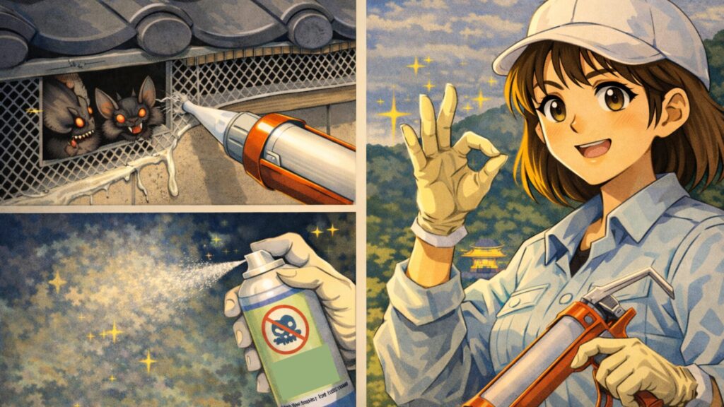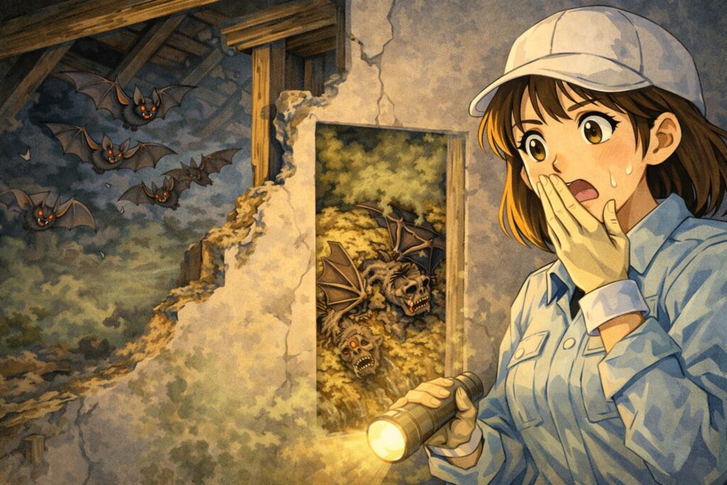 - 死骸が壁の中に残る: 知識のないまま入り口を塞ぐと、中でコウモリが餓死し、腐敗臭とウジ虫が発生する二次災害を招きます。