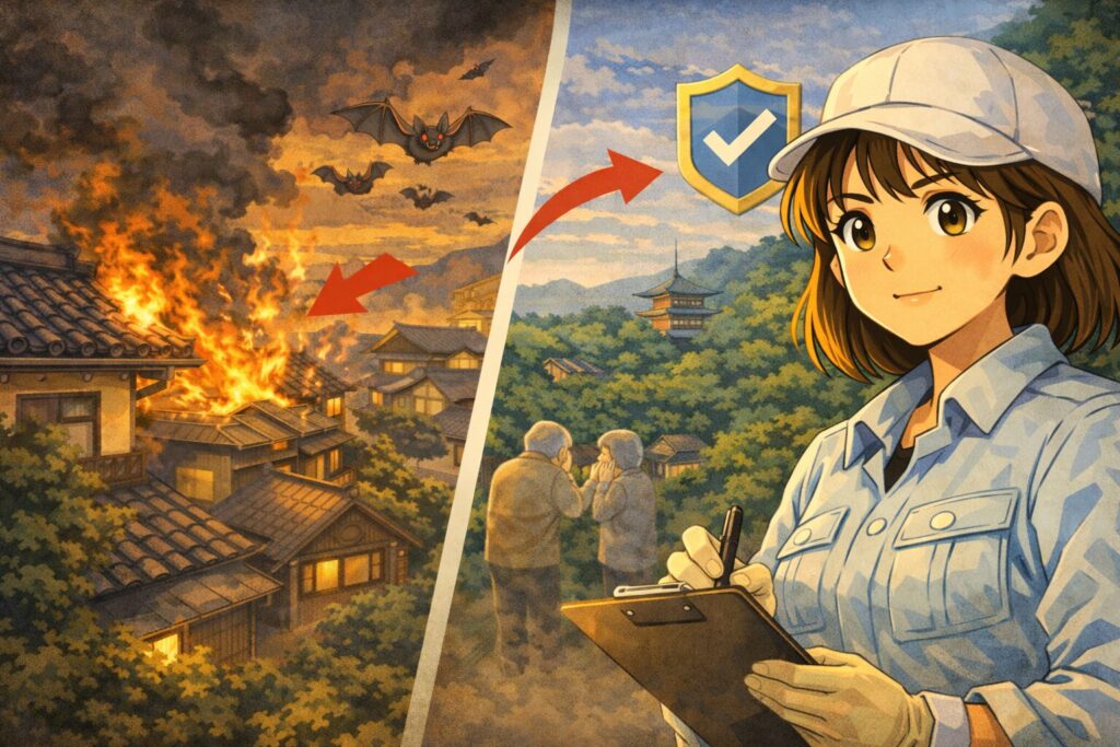 家を売る際、コウモリの被害履歴は「告知事項」になります。買い手は「菌が残っているかもしれない家」を敬遠します。28年の経験上、コウモリ被害が深刻な物件は、相場より2割〜3割安くしないと買い手がつきません。
