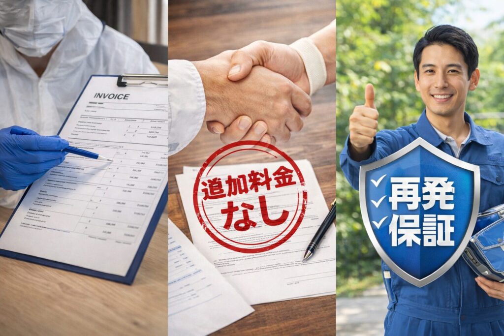 害獣駆除で追加料金を回避し、確実に家を守る唯一の方法は、「現地調査の段階で、侵入口の封鎖から再発保証までを網羅した完全固定報酬の業者」を選ぶことです。