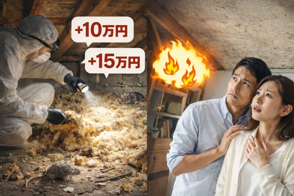 - 中期: 繁殖・糞尿による断熱材の汚染(駆除+清掃:数十万円)