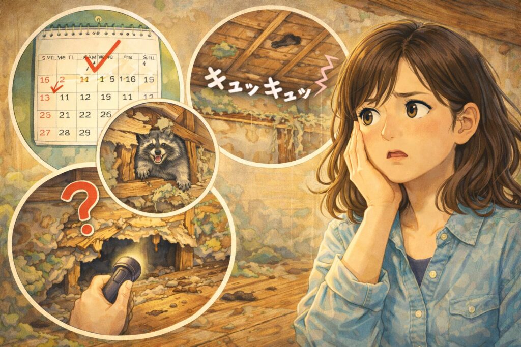 これは繁殖の合図です。子供がいる場合、親は絶対に家を離れません。DIYで親だけを追い出すと、屋根裏に残された子供が餓死し、凄まじい腐敗臭とウジ虫を発生させます。こうなると、特殊清掃レベルの費用(数十万円〜)が確定します。