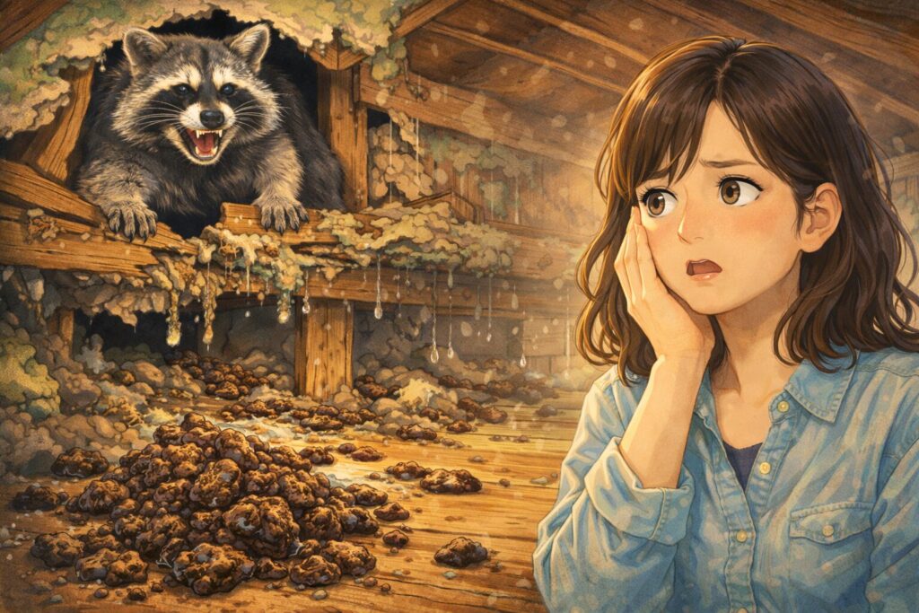 アライグマが屋根裏に住み着くということは、あなたの家が「巨大なトイレ」に変貌することを意味します。