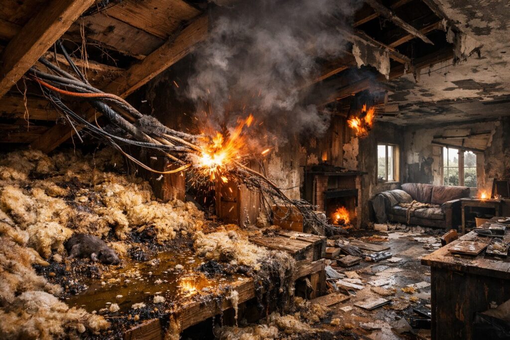 - 漏電火災というサイレントキラー ネズミやイタチは、習性として「硬いもの」をかじります。ターゲットになるのはVVFケーブル、つまり電気配線です。被覆を剥き出しにされた配線から火花が飛び、ある日突然、家全体を焼き尽くします。害獣による火災は、多くの場合「原因不明」として片付けられます。